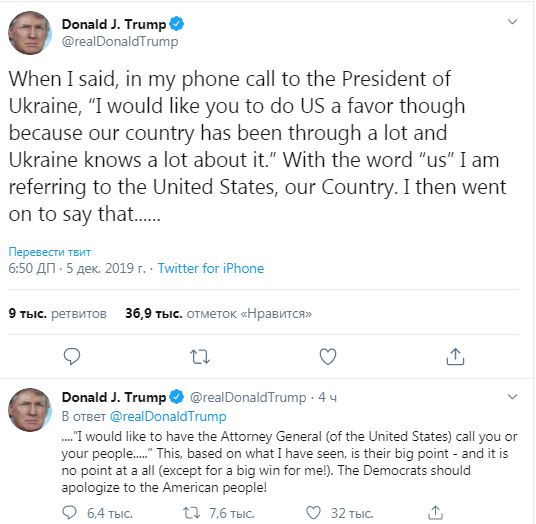Президент США Дональд Трамп признался, что в телефонном разговоре с лидером Украины Владимиром Зеленским в июле 2019 года просил оказать услугу для Соединенных Штатов, а не для себя. Об этом глава Белого дома написал в своем аккаунте Twitter.