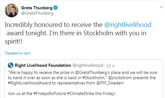Шведская экоактивистка Грета Тунберг стала одним из лауреатов премии "За целесообразное жизнеобеспечение", вручение которой состоялось в Стокгольме 4 декабря. Об этом сообщила в Twitter сама Тунберг.