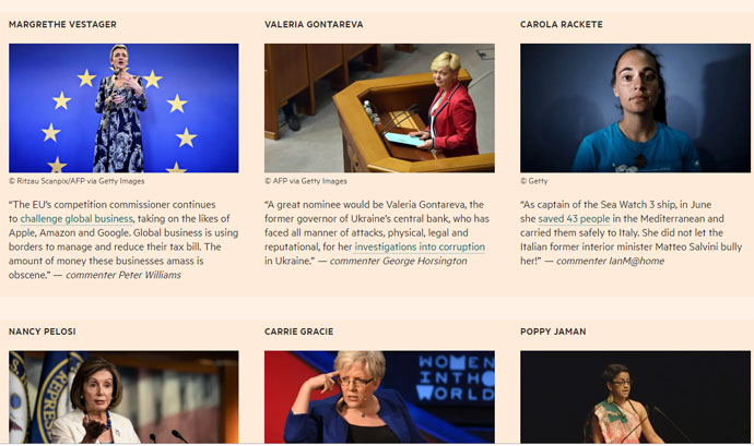 Издание уточняет, что подобный рейтинг составляется ежегодно в декабре. В этот раз было получено более 100 номинаций женщин, которые, по мнению читателей, открыли новые возможности в 2019 году или привлекли внимание к некоторым из наиболее важных проблем нашего времени, будь то в их собственном сообществе, на национальном или международном уровне. Из общего количества выделили 16 наиболее вдохновляющих.