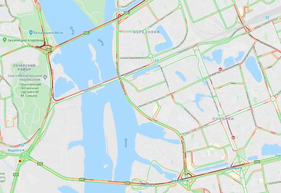 На правом берегу пробки образовались возле станций метро "Сырец", "Дорогожичи", проспекте Степана Бандеры, улицы Набережно-Крещатицкая, улице Юрия Ильенко, улице Сечевых Стрельцов, бульваре Тараса Шевченко, проспекте Победы, улице Михаила Грушевского, бульваре Леси Украинский, Набережном шоссе, улице Николая Гринченка. Проспект Валерия Лобановского также стоит.