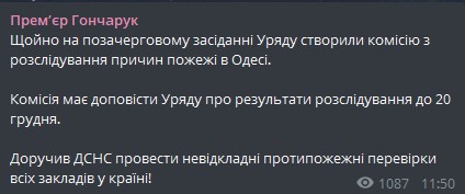 "Только что на внеочередном заседании правительства создали комиссию по расследованию причин пожара в Одессе", - написал Гончарук.