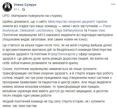 В обед почти государственный секретарь Минздрава (документы на ее назначение без испытательного срока уже направлены в Кабмин) позвонила системным администраторам сайта (одно из госпредприятий Минздрава) и сказала, что у них есть 5 минут, чтобы с сайта исчезли абсолютно все упоминания о предыдущей политической команде - новости, фотографии, видео - абсолютно все. Об этом сразу написали в WhatsApp-группе министерства и проинформировали пресс-службу (то есть меня) как ответственных за контентное содержание сайта", - написала Литовченко.