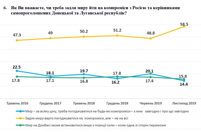 Согласно опросу, лишь 14% украинцев считают, что ради мира стоит соглашаться на любые компромиссы по сравнению с июнем 2019 года количество сторонников этой точки зрения уменьшилось на 6%.