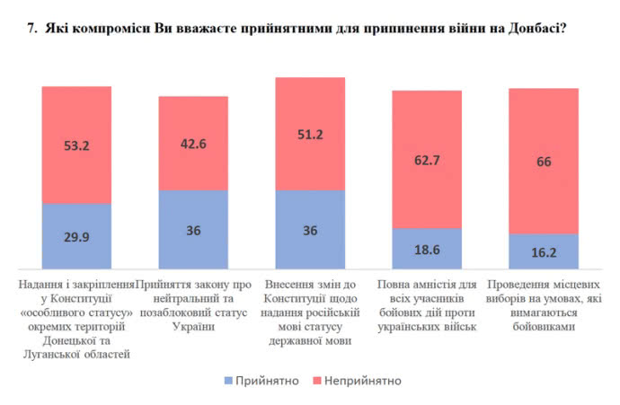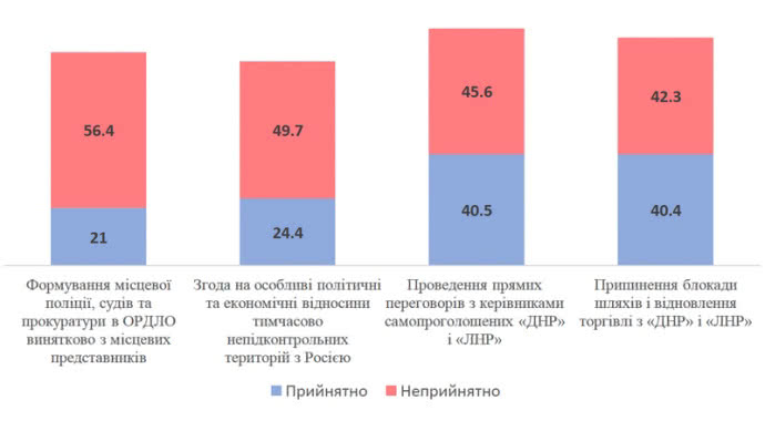 Наименее приемлемыми является проведение выборов на условиях боевиков (неприемлемо для 66% и только для 16% - приемлемо), амнистия всем участникам боевых действий против украинских войск (63% против 19%) и формирование силовых органов ОРДЛО только из местных представителей (56% против 21%).