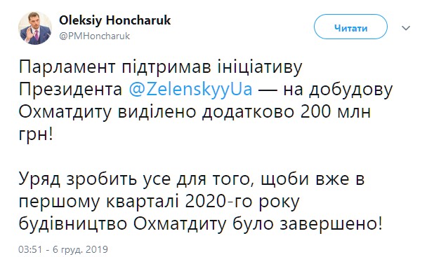 "Парламент поддержал инициативу Президента Владимира Зеленского – на достройку Охматдеа выделено дополнительно 200 млн гривен", - говорится в сообщении.