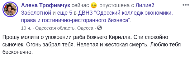 Тело еще одного погибшего в пожаре в одесском колледже опознали. Им оказался 16-летний Кирилл Трофимчук Об этом на своей странице в Facebook сообщила мама погибшего Алена Трофимчук.