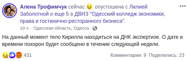 По ее словам, сейчас тело Кирилла находится на ДНК-экспертизе. В сообщении говорится, что о дате и времени похорон будет сообщено в течение следующей недели.