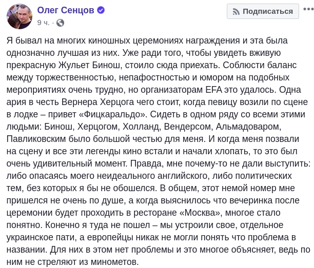Украинский режиссер Олег Сенцов, который недавно призвал не возвращать Донбасс в Украину, пока Путин у власти, раскритиковал Европейский киноприз (European Film Awards, EFA, часто называют "еврооскар" - Ред.) в Берлине за то, что ему не дали слово во время церемонии награждения и из-за того, что после награждения вечеринка прошла в ресторане "Москва". Об этом Сенцов написал на своей странице в Facebook.