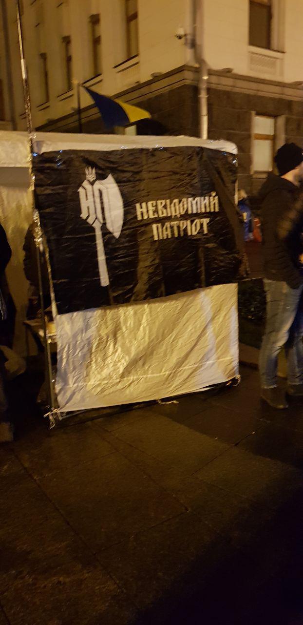 На палатках нанесены логотипы "Неизвестный патриот" и "Демократический топор".