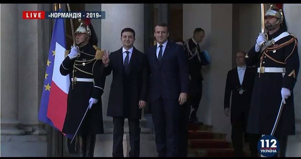 В Facebook некоторые пользователи постят и делают репосты фотографии с нормандского саммита, на котором президент Украины Владимир Зеленский стоит на ступеньках рядом с президентом Франции Эмманюэлем Макроном, Зленский своим "фирменным" жестом поднимает два пальца вверх (знак Виктория - распространённый жест, означающий победу или мир, часто использовал Черчилль, а также другие политики). Но чуть ниже на ступеньках стоит президент России Владимир Путин и знак Зеленского кажется "рожками" для Путина.