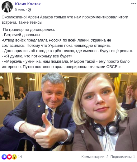 Министр внутренних дел Украины Арсен Аваков после саммита "Нормандской четверки" прокомментировал журналистам итоги встречи. Об этом в своем Facebook написала журналистка NewsOne Юлия Колтчак.
