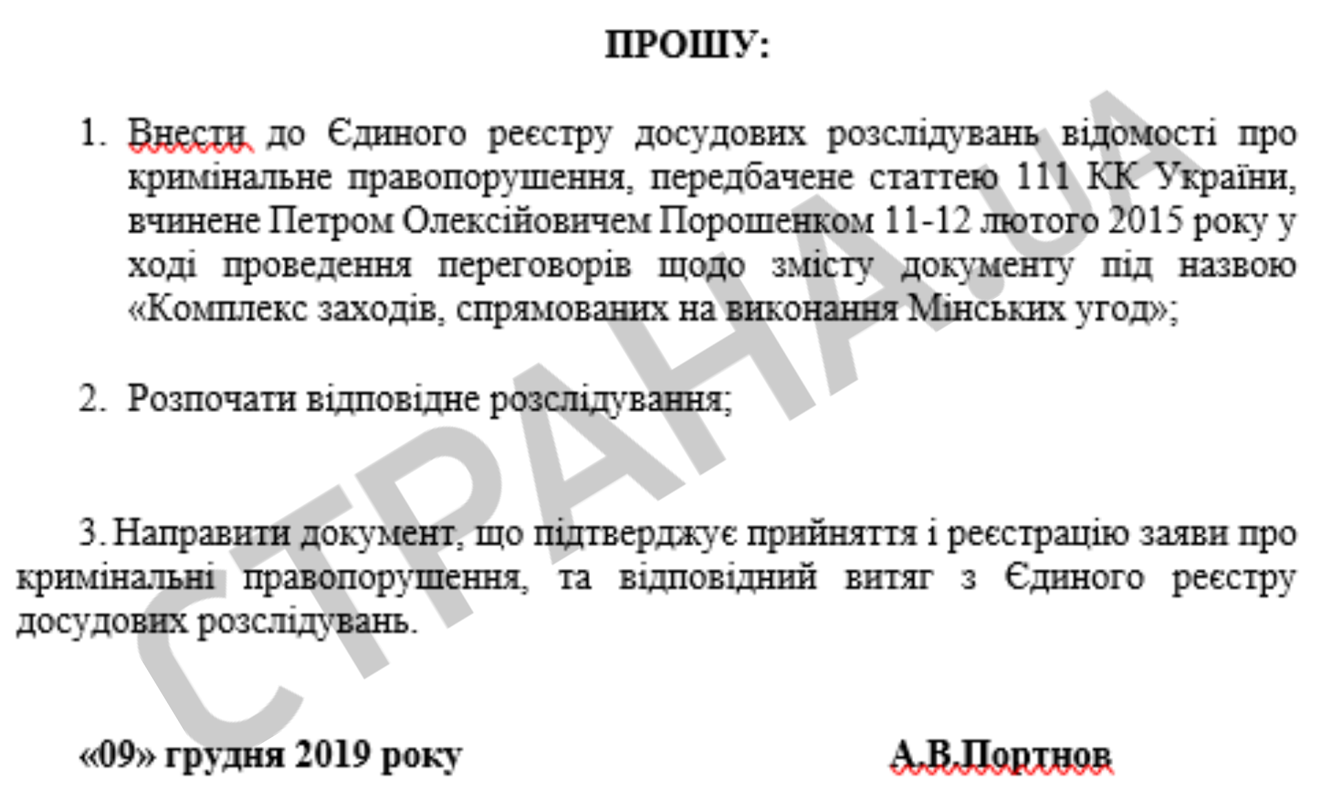 "Друзья, послезавтра подаю новое заявление о преступлении Порошенко, - государственная измена в интересах Российской Федерации при подписании в 2015 году Минских соглашений. Подробности позже", - написал Портнов у себя в телеграм-канале 8 декабря.