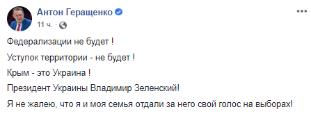 Также Геращенко в своем посте признался, что голосовал за Владимира Зеленского на президентских выборах.