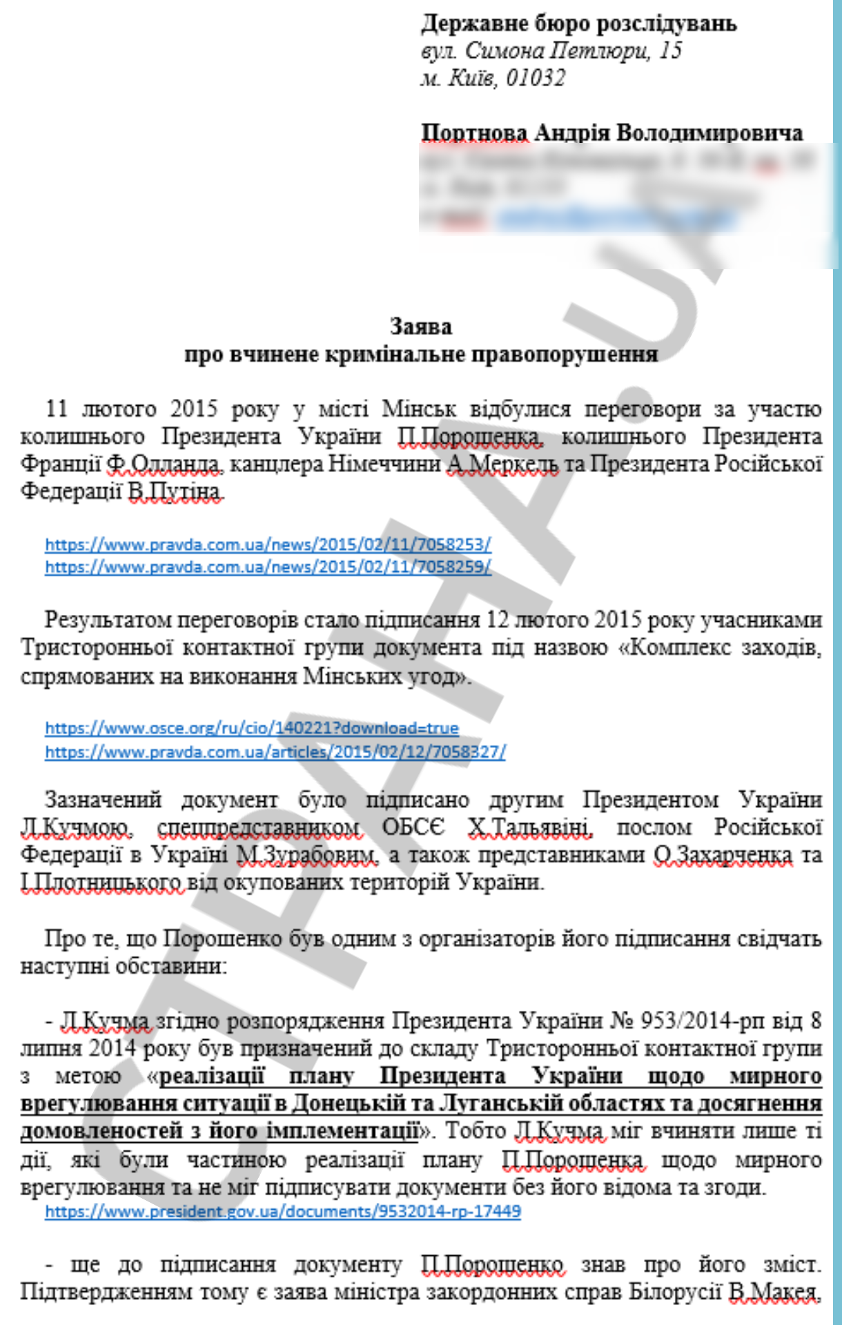В понедельник, 9 декабря, известный юрист Андрей Портнов передал в ГБР заявление о государственной измене бывшего президента Украины Петра Порошенко из-за подписания Минский соглашений. Фотокопии документа оказались в распоряжении "Страны".