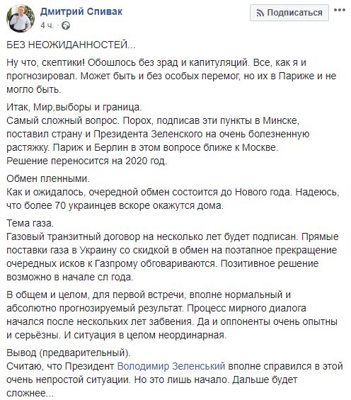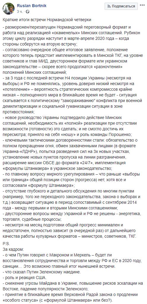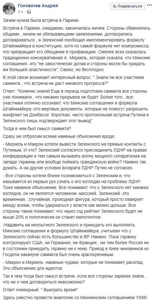 "Встреча в Париже, ожидаемо, закончилась ничем. Стороны обменялись общими , ничем не обязывающими заявлениями, договорились договариваться , а Зеленский пообещал имплементировать формулу Штайнмайера в конституцию, хотя по самой формуле нет компромисса, что превращает его обещание в профанацию. Смелее всех оказалась традиционно консервативная А. Меркель, которая сказала, что Минские соглашения -это "не закостенелая догма и стороны могли бы придать им большей эластичности". Свежо, но бесплодно.
