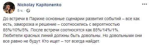 "Ну что, скептики! Обошлось без зрад и капитуляций. Все, как я и прогнозировал. Может быть и без особых перемог, но их в Париже и не могло быть.