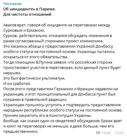 "Аваков врет, говоря об инциденте на переговорах между Сурковым и Ермаком. Сурков, действительно, отказался обсуждать изменения в ранее согласованный сторонами проект коммюнике. Это касалось абзаца о предоставлении Украиной Донбассу особого статуса на постоянной основе. Украинцы пытались отказаться от этого обязательства. Тогда помощник Путина заявил, что российская сторона приостановит участие в переговорах, если данный пункт будет нарушен", - заявил Чеснаков.