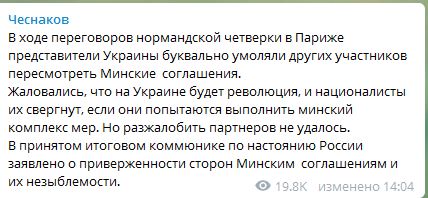 "Жаловались, что на Украине будет революция, и националисты их свергнут, если они попытаются выполнить минский комплекс мер. Но разжалобить партнеров не удалось. В принятом итоговом коммюнике по настоянию России заявлено о приверженности сторон Минским соглашениям и их незыблемости", - подытожил он.