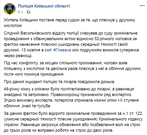 Следователи Васильковского отдела полиции установили, что 13 октября в Глевахе между 52-летним мужчиной и его 48-летней супругой вспыхнул конфликт на почве ревности. Во время ссору муж взял бутылочку с кислотой и несколько раз плеснул жидкость в лицо жене, после чего ушел.