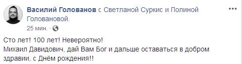 "Сто лет! 100 лет! Невероятно! Михаил Давидович, дай Вам Бог и дальше оставаться в добром здравии, с Днём рождения", - говорится в обращении.