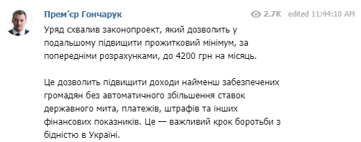 Как пишет премьер, этот законопроект внесет изменения в Бюджетный кодекс и позволит в дальнейшем повысить прожиточный минимум, по предварительным расчетам, до 4200 гривен в месяц.
