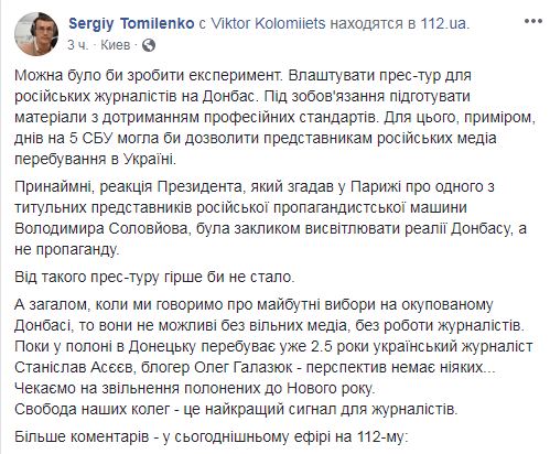 "Можно было бы сделать эксперимент. Устроить пресс-тур для российских журналистов на Донбасс. Под обязательство подготовить материалы с соблюдением профессиональных стандартов. Для этого, к примеру, дней на 5 СБУ могла бы позволить представителям российских медиа пребывания в Украине", - написал Томиленко.