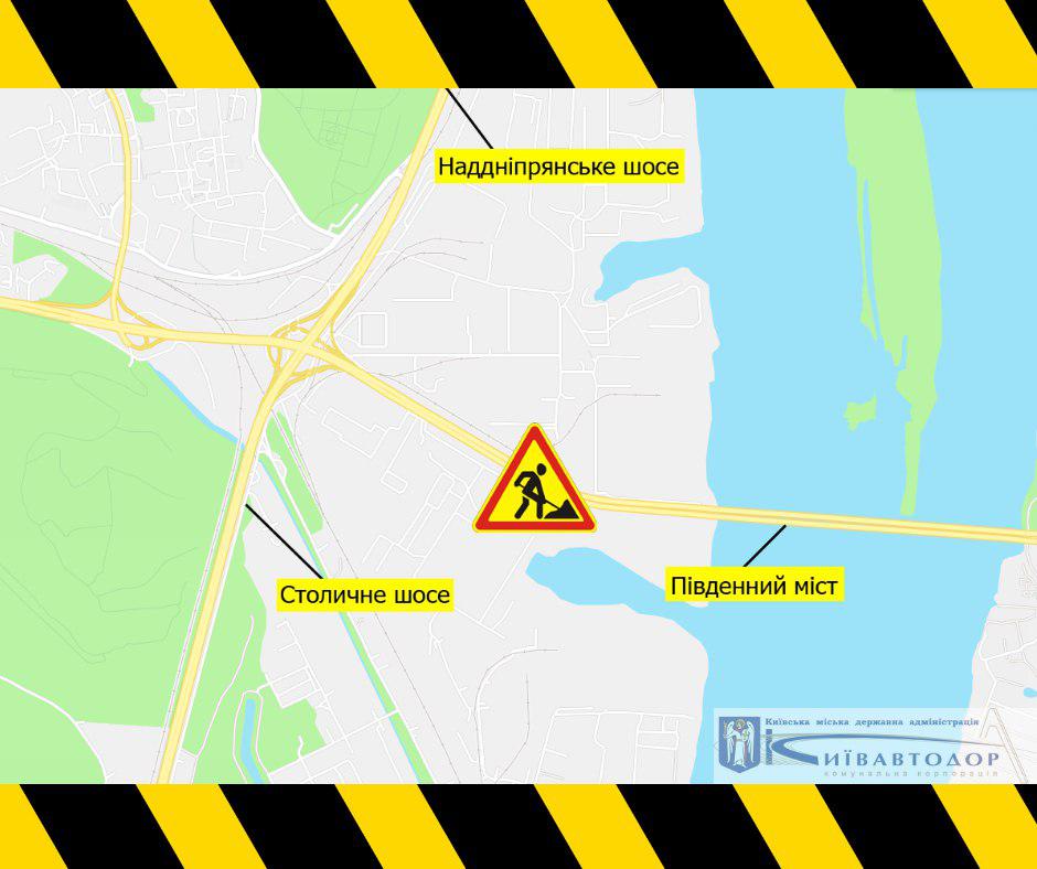 "На эстакаде Южного моста ограничат движение транспорта: с 21:00 13 декабря до 20:00 15 декабря - в направлении ст. м. "Выдубичи", с 21:00 14 декабря в 7:00 15 декабря - в направлении просп. Бажана", - гуточнили сроки в мэрии.