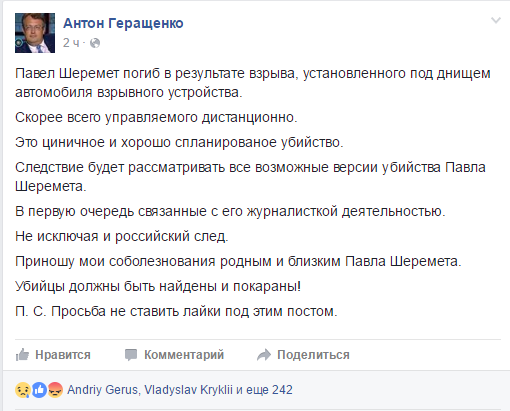 "Можно предположить, что взрыв, в результате которого погиб журналист Павел Шеремет, является подготовленным заказным убийством, заказ на которое поступил из Российской Федерации... Результаты предварительного расследования умышленного убийства Павла Шеремета на этом этапе позволяют сделать вывод, что это преступление — тщательно подготовленное группой лиц заказное убийство. Следствие не исключает версию заказного политического убийства, заказ на которое поступил именно из Российской Федерации... В результате мониторинга соединения в районе места преступления, в промежутке, близкому ко времени его совершения, зафиксировано 1193 соединения с российскими абонентами, активизация части этих абонентов совпадает по времени, по сигналам предыдущей информационной активности, которая у нас была во время Крестного ходы УПЦ МП в 2016 году в июле...", - говорил тогда министр.