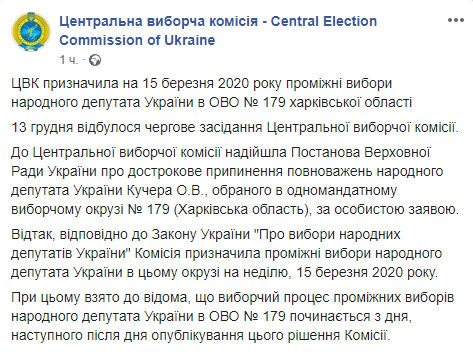 "В соответствии с Законом Украины "О выборах народных депутатов Украины" Комиссия назначила промежуточные выборы народного депутата Украины в этом округе на воскресенье, 15 марта 2020 года", - говорится в сообщении.