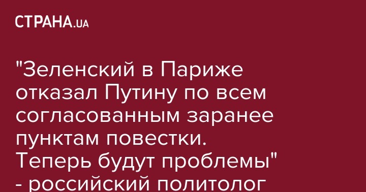 "Зеленский в Париже отказал Путину по всем согласованным заранее пунктам повестки. Теперь будут проблемы" - российский политолог