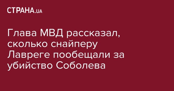 Министр внутренних дел Украины Арсен Аваков заявил, что снайперу Андрею Лавреге, застрелившему ребенка во время покушения на депутата Киевского облсовета Вячеслава Соболева, пообещали тысячу долларов перед нападением и 20 тысяч в случае успеха "операции".