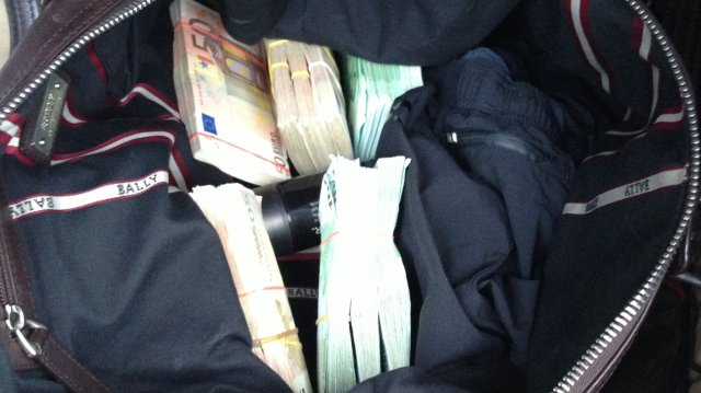 Издание публикует фото, на которых видны сумки, полные наличных, а именно пачки банкнот по 100 и 50 евро, перевязанные резинками, и лежащие в багажнике автомобиля.