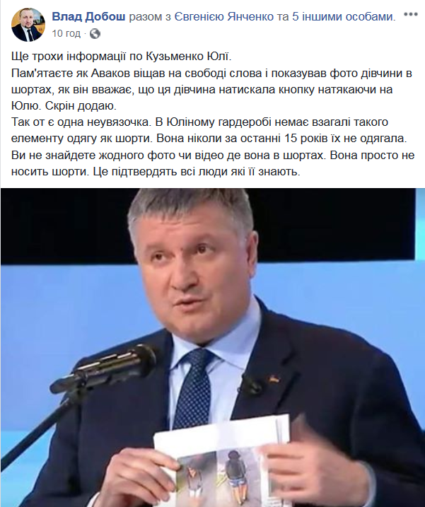Так же адвокат заявил, что на фото подрывницы, которое показывал глава МВД Арсен Аваков, совсем не его подзащитная, так как там девушка в шортах, а Кузьменко, по его словам, в шортах никогда не ходила.