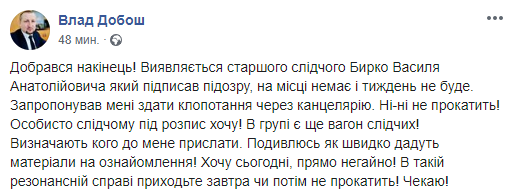 "Предложил мне сдать ходатайство через канцелярию. Нет-нет, не прокатит! Лично следователю под роспись хочу! В группе есть еще вагон следователей! Определяют кого ко мне прислать. Посмотрю, как быстро дадут материалы на ознакомление! Хочу сегодня, прямо немедленно! В таком резонансном деле приходите завтра или потом не прокатит! Жду!" - написал в соцсети Влад Добош.