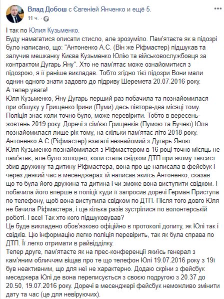 Антоненко А. С. (Рифмастер) вообще незнаком с Яной Дугар. Юля Кузьменко познакомилась с Рифмастером в 16 году точно месяц не помнит, но было холодно, когда стала свидетелем ДТП при котором таксист сбил жену и ребенка Рифмастера, она об этом написала в фейсбук и через некоторое время в мессенджерах ей написал какой-то Антоненко, сказал что это была его жена и ребенок и сможет ли она выступить свидетелем. И увидела его впервые в полиции, куда ее пригласил кстати Герман Приступа по телефону, чтобы она выступила свидетелем по ДТП. После того долго Юля не видела Рифмастера, и еще несколько раз встретились по волонтерской работе. И все! Так кто кого подыскивал?" - написал адвокат и добавил, что все это будет изложено официально в протоколе допроса, как Юлии Кузьменко, так и свидетелей.