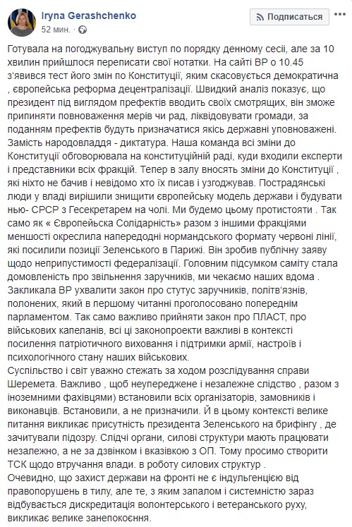 "На сайте ВР в 10:45 появился тест его изменений в Конституцию, которым отменяется демократическая, европейская реформа децентрализации. Быстрый анализ показывает, что президент под видом префектов вводит своих смотрящих, он сможет прекращать полномочия мэров или советов, ликвидировать общины, по представлению префектов будут назначаться какие-то государственные уполномоченные. Вместо народовластия – диктатура. Постсоветские люди во власти решили уничтожить европейскую модель государства и строить нью-СССР с Генсекретарем во главе", - заявила она.