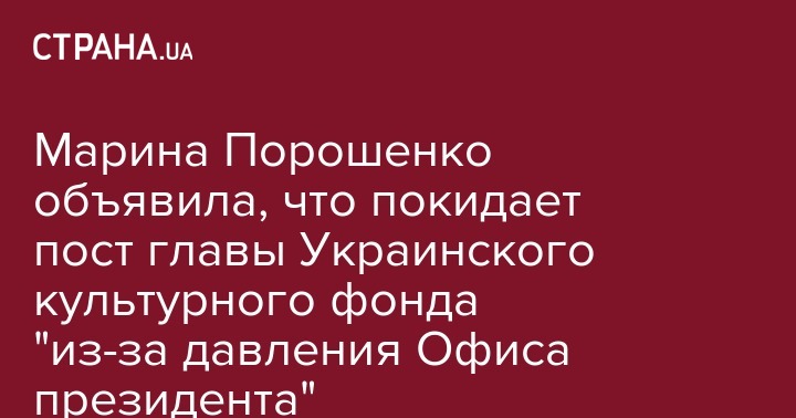 Глава Украинского культурного фонда (УКФ), супруга экс-президента Петра Порошенко Марина написала заявление о досрочном прекращении своих полномочий в связи с давлением со стороны действующей власти на членов команды Фонда. Об этом сообщает Интерфакс-Украина.