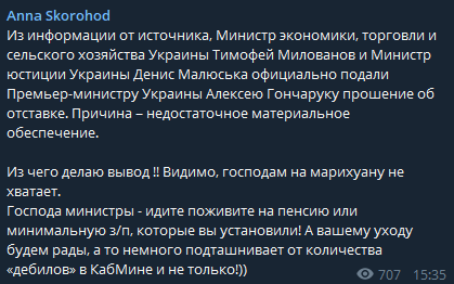"Из чего делаю вывод! Видимо, господам на марихуану не хватает. Господа министры - идите поживите на пенсию или минимальную з/п, которые вы установили! А вашему уходу будем рады, а то немного подташнивает от количества "дебилов" в Кабмине и не только!", - написала Скороход.