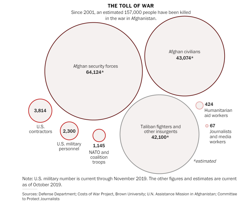 По приведенным изданием данным Министерства обороны, с 2001 года более 775 000 американских военнослужащих были направлены в Афганистан, причем многие неоднократно. Из них 2300 человек погибли и 20 589 были ранены в бою.