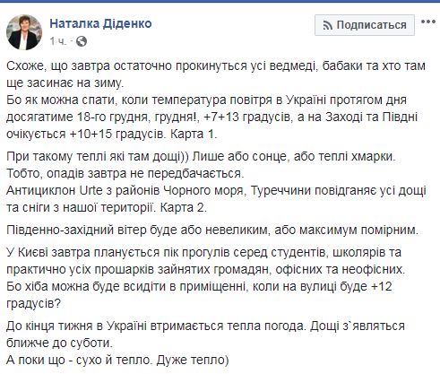 Как отметила синоптик, антициклон Urte из районов Черного моря и Турции отгонит все дожди и снега с территории нашей страны. А юго-западный ветер будет или небольшим, или максимум умеренным. "В Киеве завтра планируется пик прогулов среди студентов, школьников и практически всех слоев занятых граждан, офисных и не офисных. Разве можно будет сидеть в помещении, когда на улице будет +12 градусов?" – пошутила Диденко, рассказывая о синоптической ситуации 18 декабря в столице.