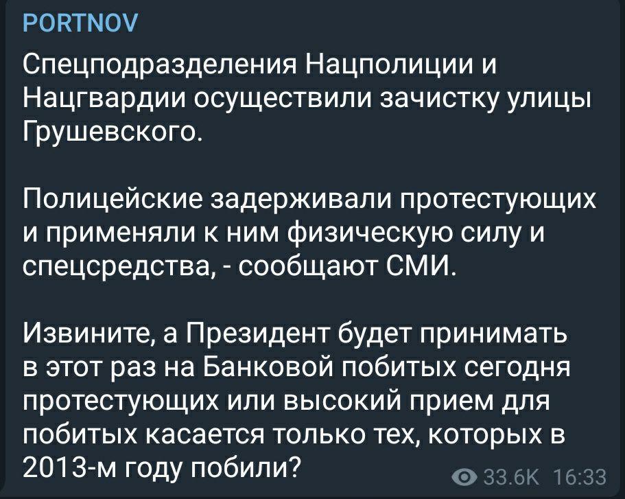 "Спецподразделения Нацполиции и Нацгвардии осуществили зачистку улицы Грушевского. Полицейские задерживали протестующих и применяли к ним физическую силу и спецсредства, - сообщают СМИ. Извините, а Президент будет принимать в этот раз на Банковой побитых сегодня протестующих или высокий прием для побитых касается только тех, которых в 2013-м году побили?" - написал юрист Андрей Портнов.