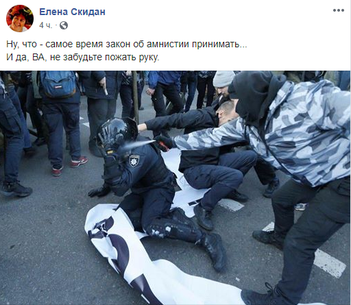 "Ну, что - самое время закон об амнистии принимать... И да, ВА, не забудьте пожать руку" - написала журналист Елена Скидан под фото, где в полицейского распыляет газ участник акции под парламентом.