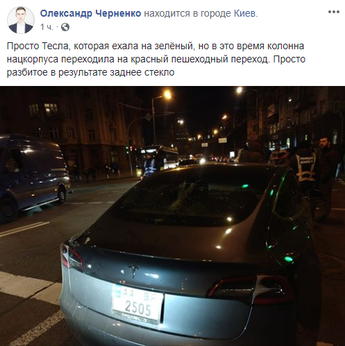 "Просто Тесла, которая ехала на зелёный, но в это время колонна нацкорпуса переходила на красный пешеходный переход. Просто разбитое в результате заднее стекло" - написал Александр Черненко.