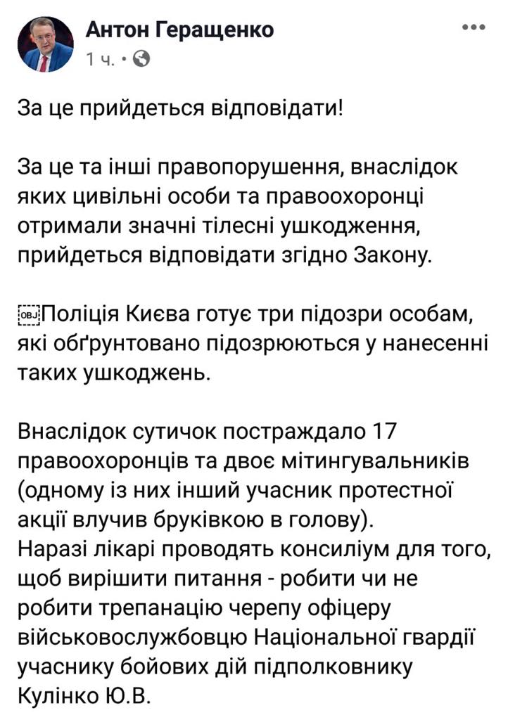 "За это и другие правонарушения, в результате которых гражданские лица и правоохранители получили значительные телесные повреждения, придется отвечать по закону. Полиция Киева готовит три подозрения лицам, обоснованно подозреваемым в нанесении таких повреждений. В результате столкновений пострадали 17 правоохранителей и двое митингующих (одному из них другой участник акции протеста попал камнем в голову). Сейчас врачи проводят консилиум для того, чтобы решить вопрос, делать или не делать трепанацию черепа офицеру, военнослужащему Национальной гвардии, участнику боевых действий подполковнику Кулинко Ю.В.", - написал пост в своем Facebook Антон Геращенко.