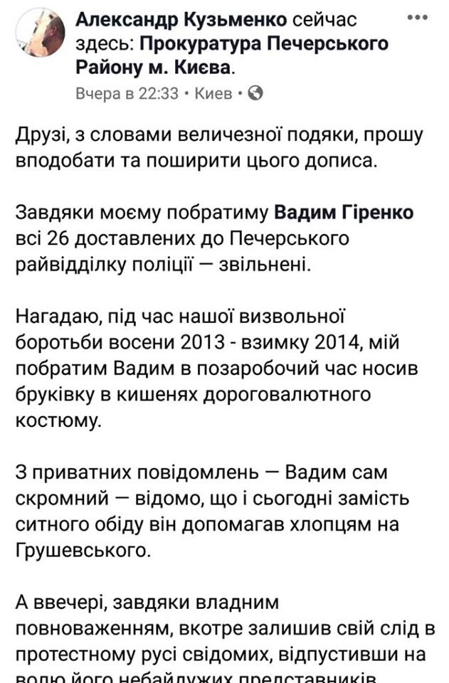 Эти сведения на своей странице в Facebook подтвердил бывший первый заместитель прокурора Печерского района Киева Александр Кузьменко.