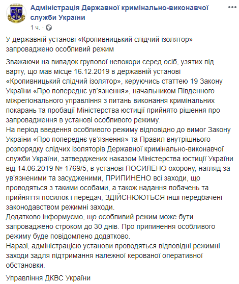 В СИЗО Кропивницкого введен особый режим в связи групповым неповиновением заключенных в понедельник, 16 декабря. Об этом сообщает администрация Государственной уголовно-исполнительной службы Украины на своей странице в соцсети.