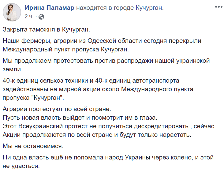 "Закрыта таможня в Кучурган. Наши фермеры, аграрии из Одесской области сегодня перекрыли Международный пункт пропуска Кучурган. Мы продолжаем протестовать против распродажи нашей украинской земли", - говорится в сообщении.