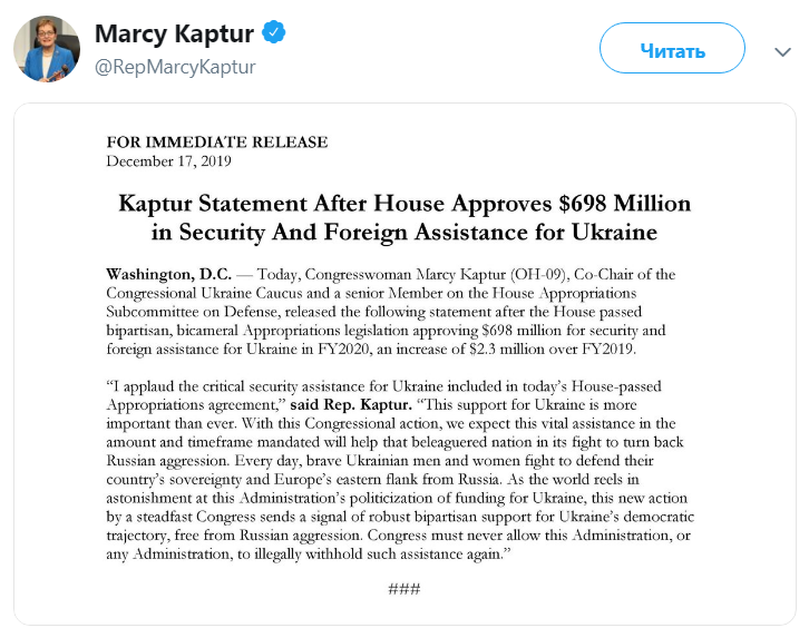 "В настоящее время, когда весь мир озадачен политизацией вопроса финансовой поддержки Украины со стороны администрации США, эти новые меры со стороны последовательного Конгресса дают сигнал о надежной и мощной двухпартийной поддержке демократического пути Украины, свободной от российской агрессии. Конгресс не должен позволять этой или любой другой администрации снова незаконно задерживать подобную поддержку", - говорится в заявлении конгрессвумен, представителя демократов Марси Каптур.