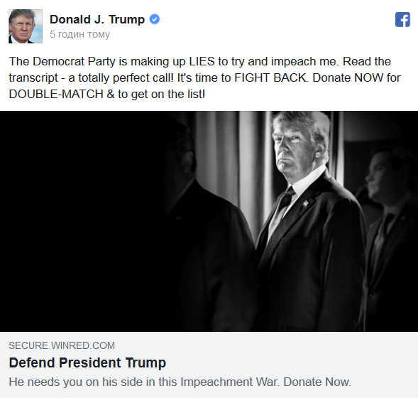 "Демократическая партия лжет, пытаясь организовать мне импичмент. Читайте стенограмму (телефонного разговора с Зеленским - Ред.) - совершенно безупречный разговор! Пришло время бороться!", - написал Дональд Трамп и призвал сторонников жертвовать на его предвыборную кампанию.