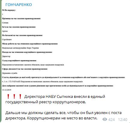 Гончаренко также привел выдержку из госреестра и добавил, что "дальше мы должны сделать все, чтобы он был уволен с поста директора". "Коррупционерам не место во власти", - резюмировал он.